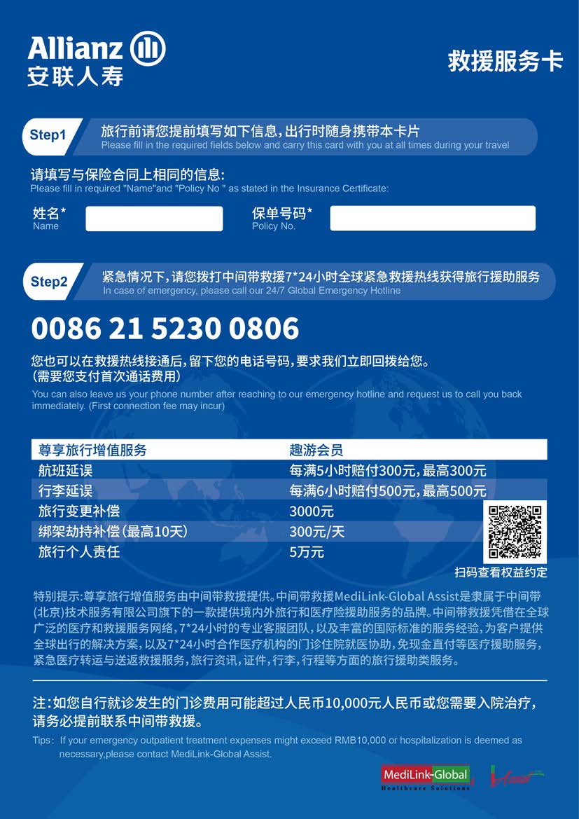 救援电话0086 21 5230 0806 拨打接听0.96元/分钟