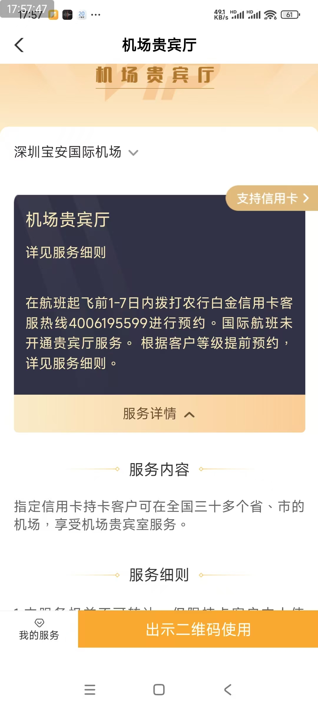 拿到登机牌后去F、G之间的贵宾厅,说明是农行贵宾厅服务,登机牌交给柜台办理手续,出示二维码核销(农行APP-我的-礼券-机场贵宾)。